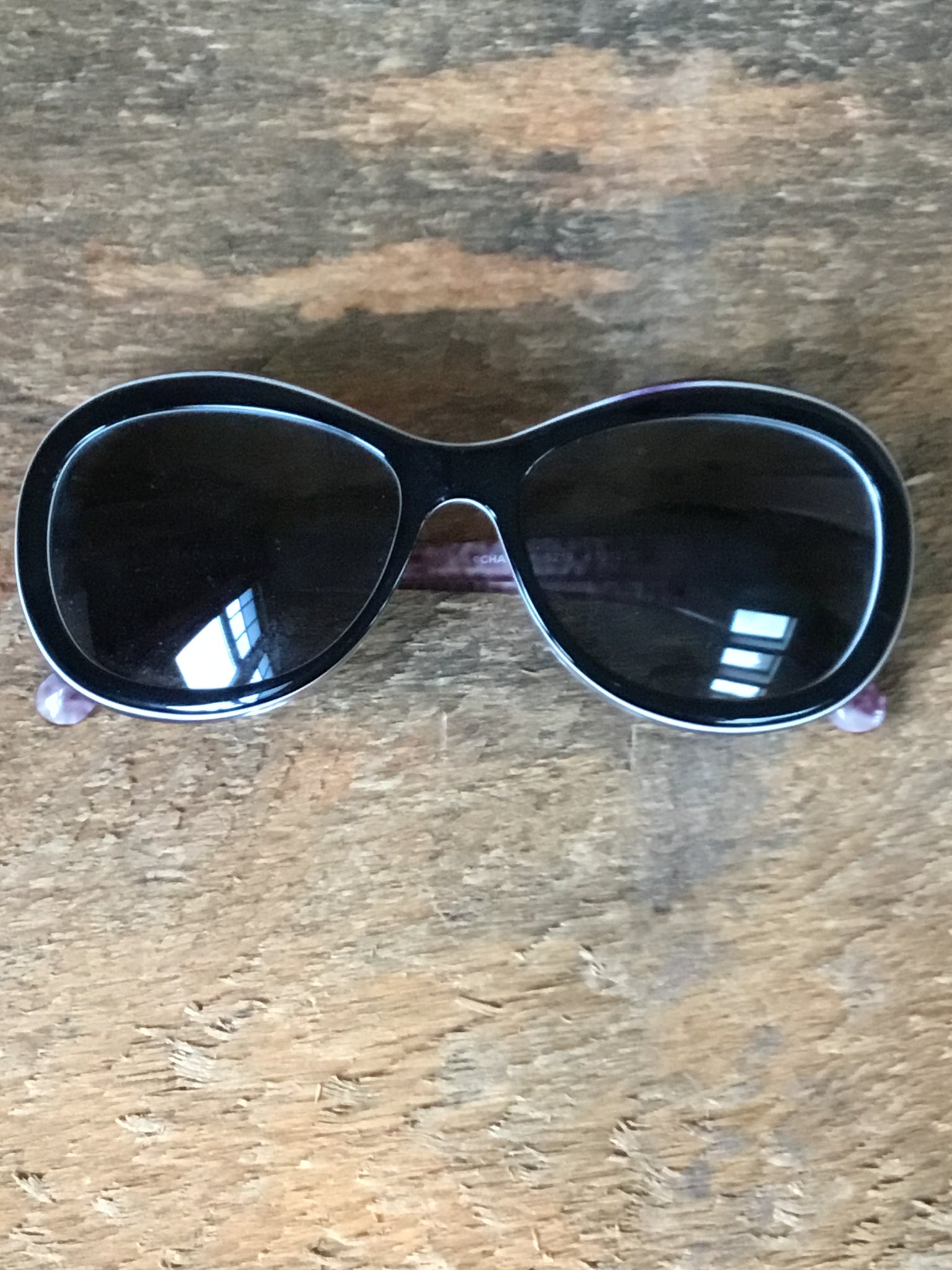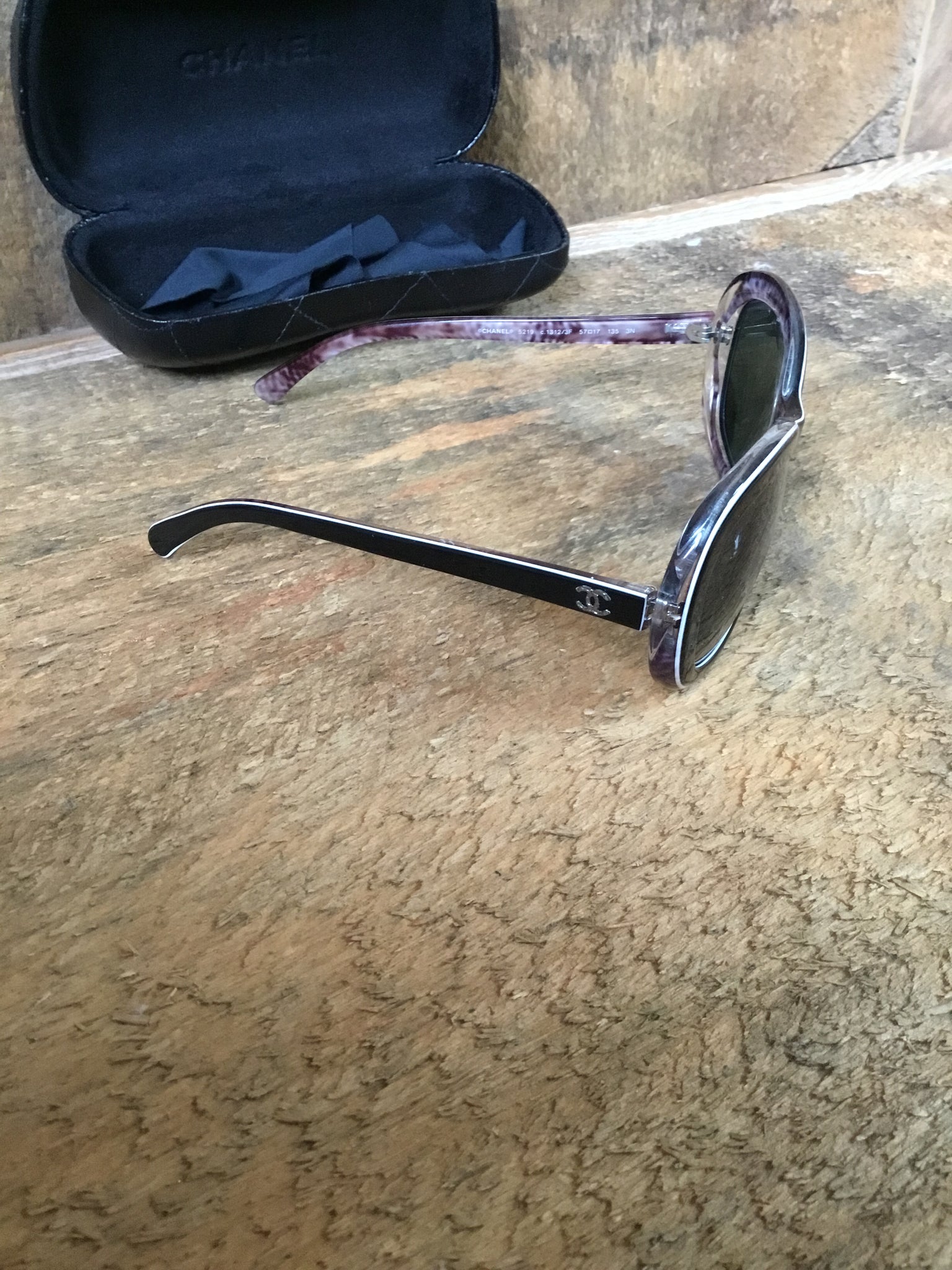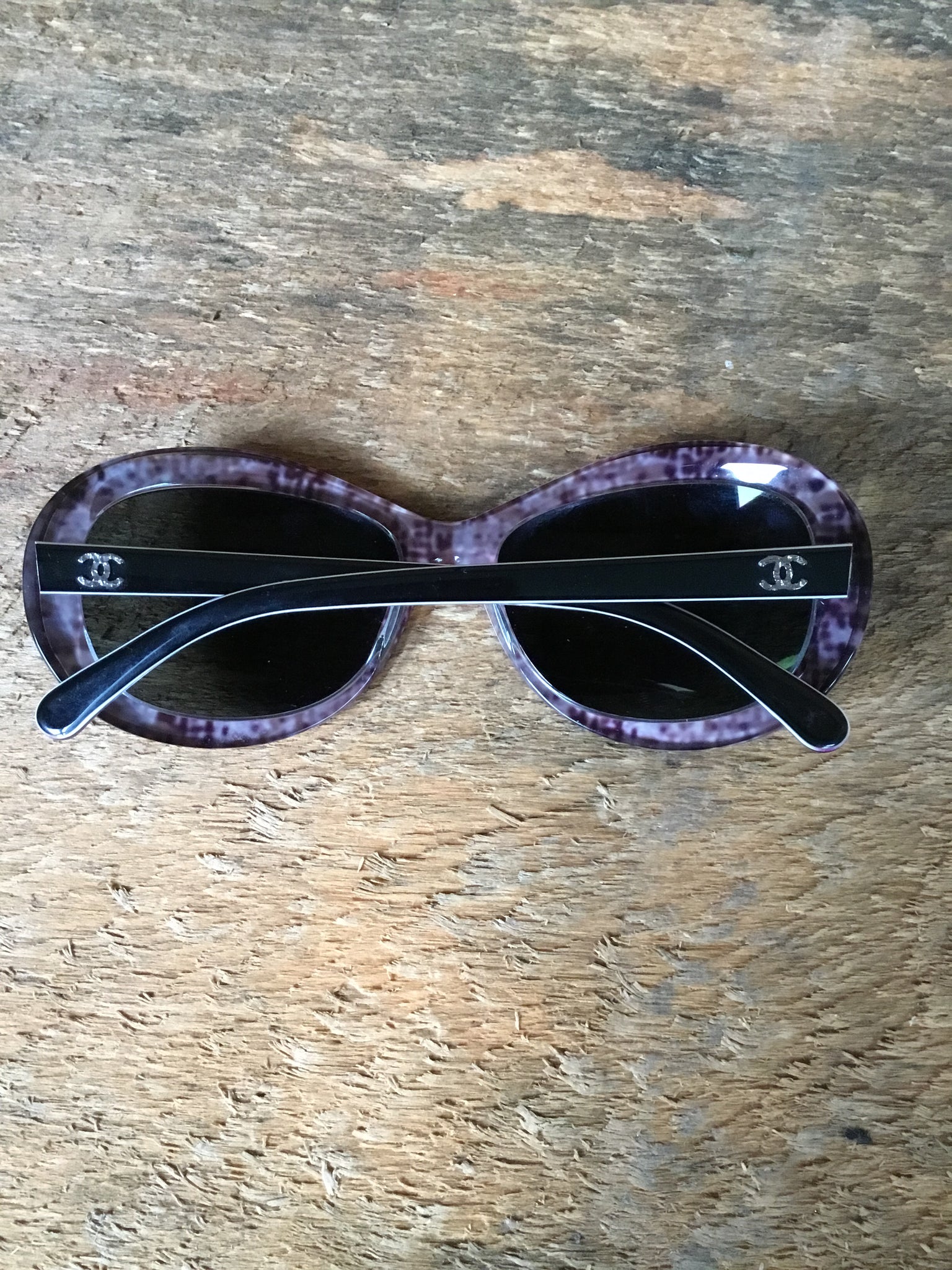 Vintage designer sunglasses by Chanel. Black frames with white detail on front and a purple tortoise on inside. Black lenses. Some scratches, these are vintage. Comes in original case. BRAND: Chanel SIZE: OS