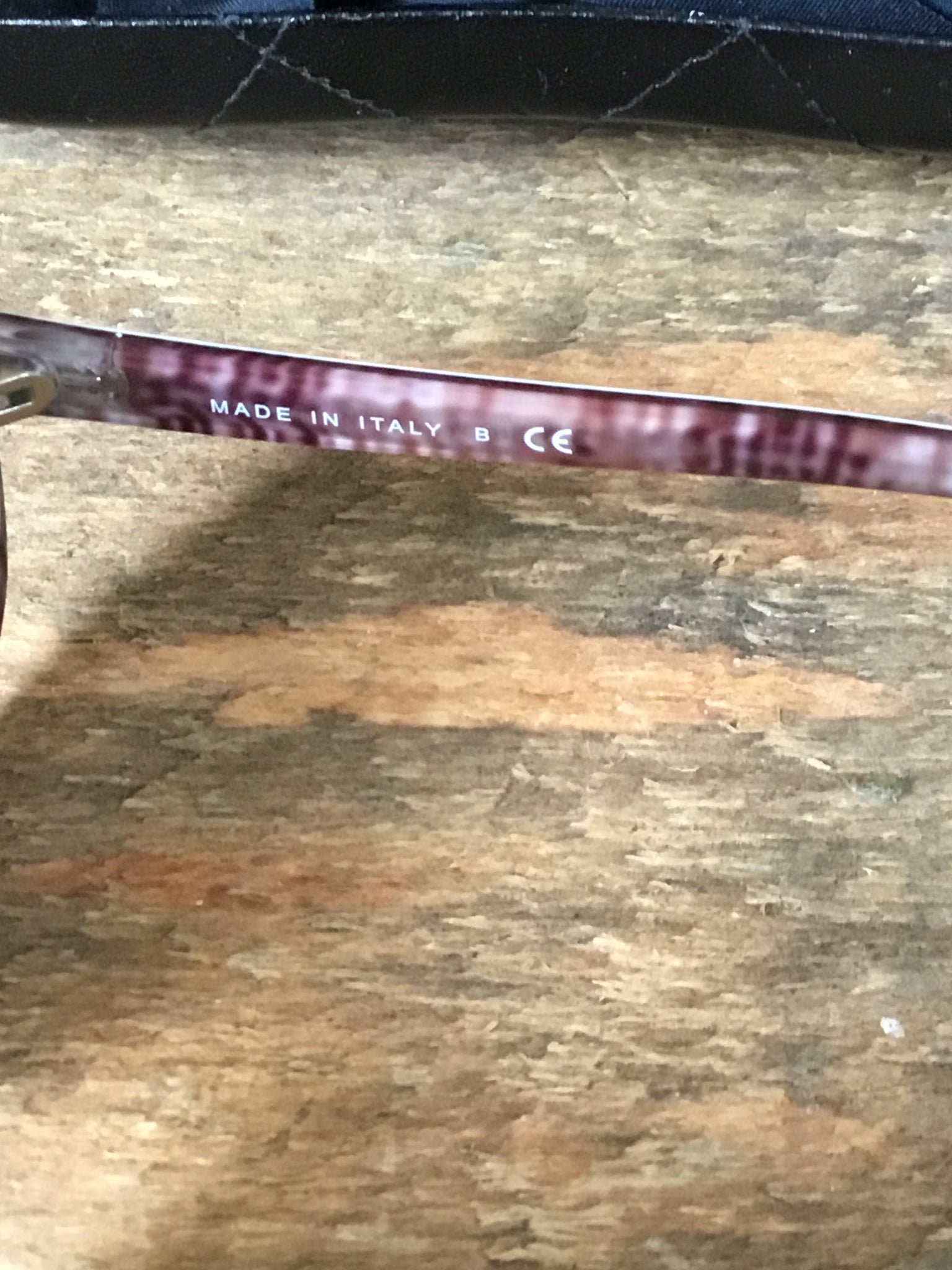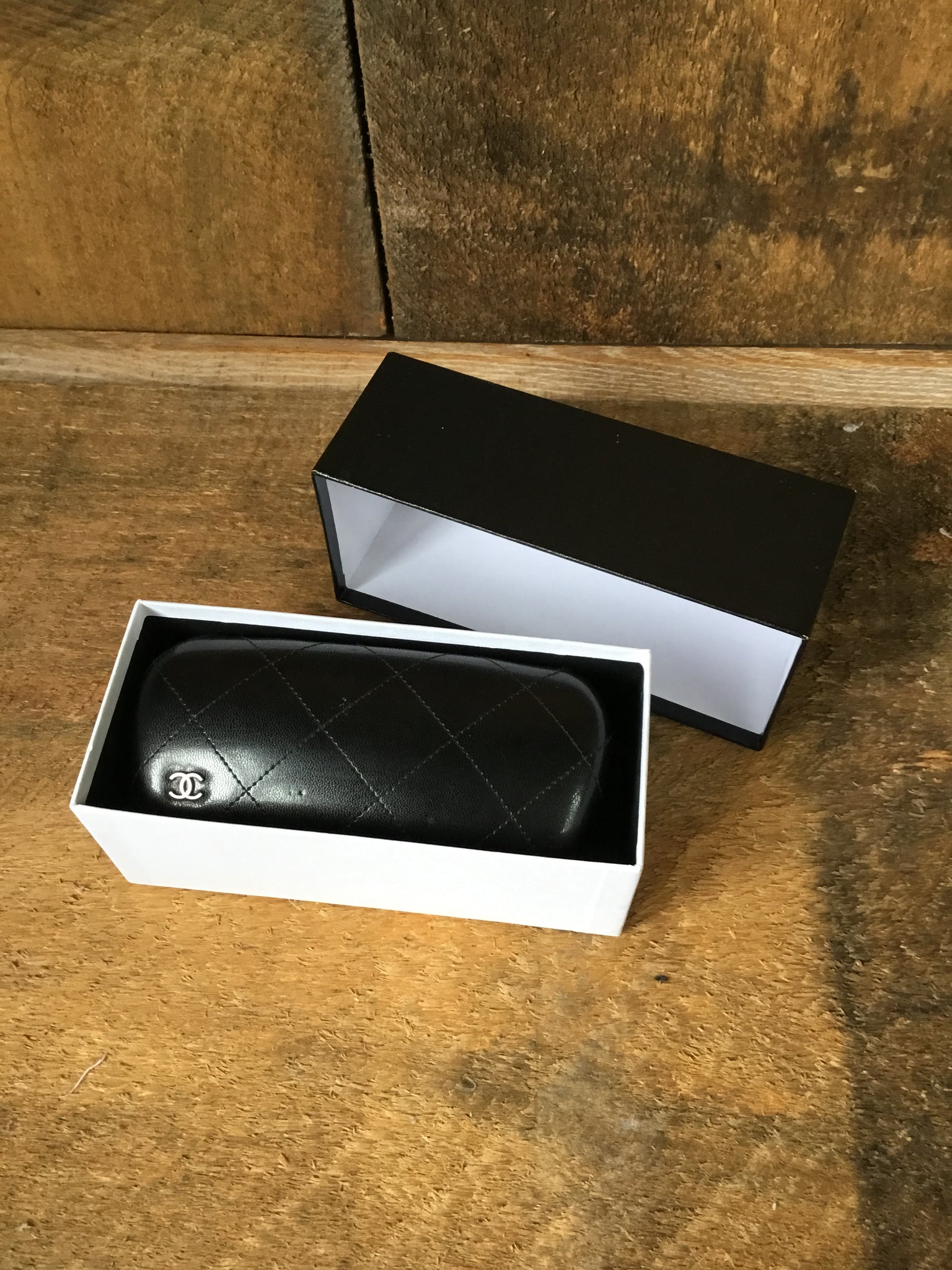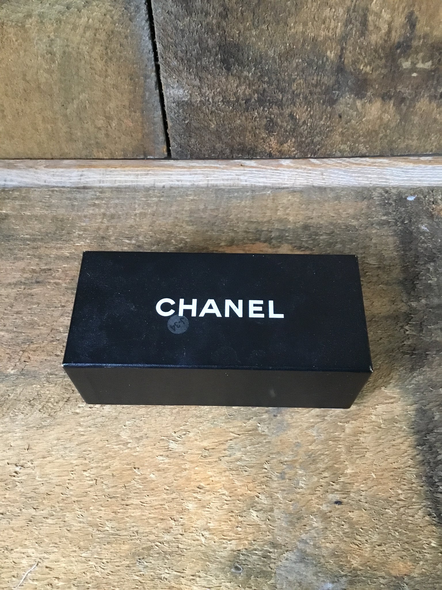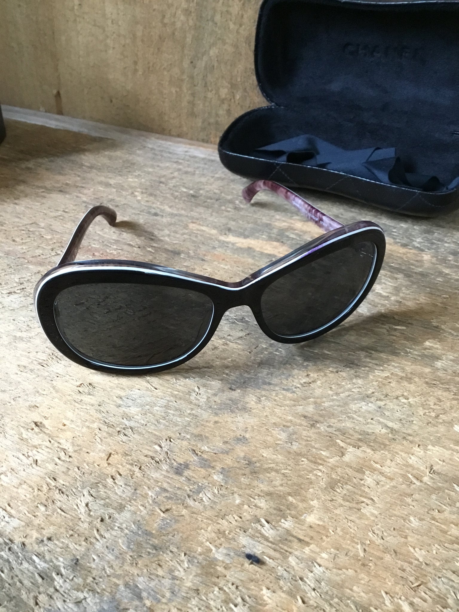 Vintage designer sunglasses by Chanel. Black frames with white detail on front and a purple tortoise on inside. Black lenses. Some scratches, these are vintage. Comes in original case. BRAND: Chanel SIZE: OS